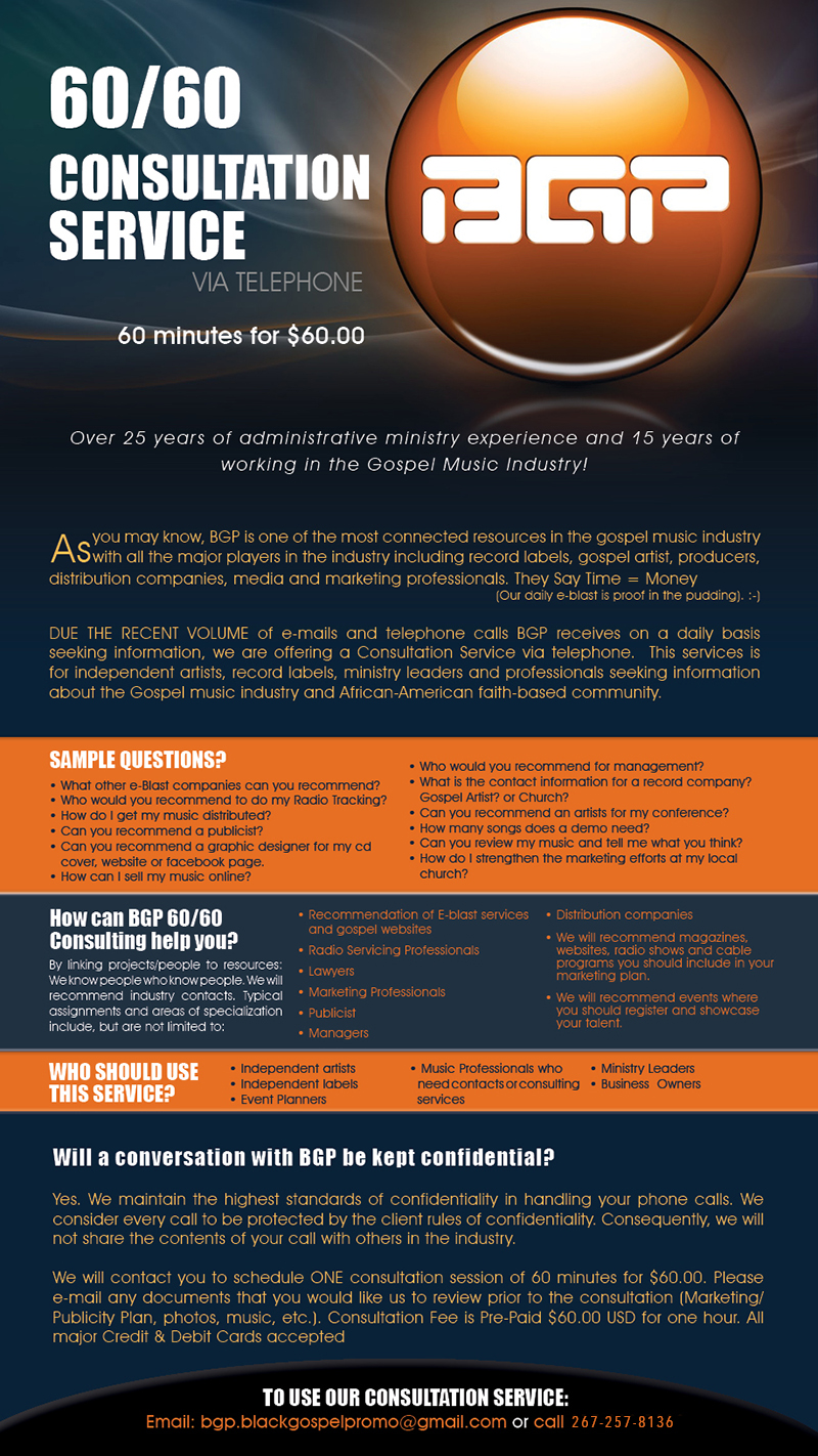 | Promote your ministry, business, label, pastor, artist, cd, book, or event www.blackgospelpromo.com | bgp.blackgospelpromo@gmail.com | tel: 267-257-8136 45 E. Cityline Avenue - #303, Bala Cynwyd, PA 19004 |